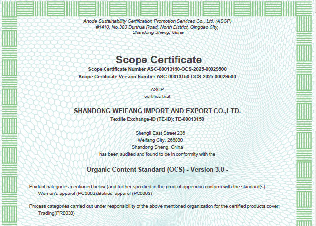 公司自營(yíng)和代理服裝、食品、五金、化工、機(jī)電等各類商品及技術(shù)的進(jìn)出口業(yè)務(wù),公司有專門的生產(chǎn)、加工基地,并通過(guò)了Oeko - Tex Standard 100、GRS、OCS、RCS、USCTP等多項(xiàng)認(rèn)證,可以按客戶要求設(shè)計(jì)生產(chǎn),同時(shí)承辦中外合資經(jīng)營(yíng)、合作生產(chǎn)、開展“三來(lái)一補(bǔ)”以及技術(shù)輸出、易貨、邊境貿(mào)易等業(yè)務(wù)。公司產(chǎn)品出口到日本、法國(guó)、俄羅斯等50多個(gè)國(guó)家或地區(qū)。